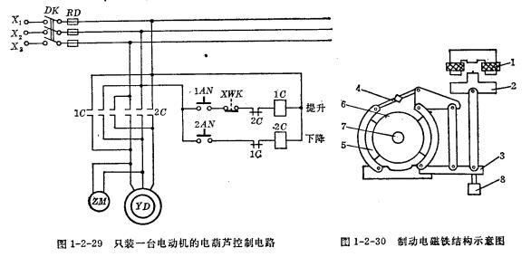圖1-2-29為只裝有一臺電動機(jī)的電葫蘆控制電路,主要是用來提升貨物,圖中有兩個按鈕,1AN為提升按鈕,2AN為下降按鈕。為保證安全,為用接觸器的自鎖觸頭,因此在按下按鈕時電動機(jī)就轉(zhuǎn)動,松開按鈕,電動機(jī)就立即停止轉(zhuǎn)動。這種電路常稱為點(diǎn)動控制電路。當(dāng)按下1AN時,接觸器1C使電動機(jī)轉(zhuǎn)動,將貨物起吊;當(dāng)按下按鈕2AN時,接觸器2C使電動機(jī)向相反方向轉(zhuǎn)動,將貨物下降。由于常閉觸頭2C和1C的互鎖作用,在按下1AN后被誤按了2AN就不起作用,反之亦然,這樣可以防止電源短路事故的發(fā)生。XWK為終點(diǎn)開關(guān)(形成開關(guān))當(dāng)起吊貨物升到極限高度后,斷開終點(diǎn)開關(guān)觸頭,電動機(jī)自動停止運(yùn)轉(zhuǎn)。ZM為片式制動器(見圖1-2-30)。制動電磁鐵的線圈為電動機(jī)電源并聯(lián)。當(dāng)接通電源后,制動電磁鐵線圈通電,銜鐵2被吸上,借杠桿3及杠4的作用將瓦塊5推開,電動機(jī)軸7可以自由轉(zhuǎn)動。當(dāng)電源斷開后,制動電磁鐵線圈也斷電,重物8將銜鐵2拉下,瓦塊5抱緊制動輪6,使電動機(jī)軸不能轉(zhuǎn)動,因而一旦出現(xiàn)停電,可以將被提升的貨物之車在任何一個高度上。