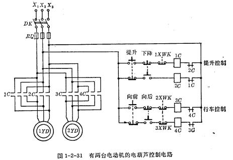 圖1-2-31為有兩臺電動機(jī)的電葫蘆控制電路。1YD為提升用電動機(jī),2YD為行車用電動機(jī),控制電路的工作原理與上述相同,不再重復(fù)。