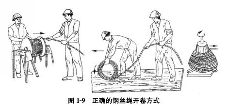 鋼絲繩通??偸浅删恚ūP)供應(yīng)的,一卷鋼絲繩的長度有多種規(guī)格,如250m、500m和1000m等。多層建筑施工用的塔式起重機(jī)的起升鋼絲繩通常為100-150m,而中高層建筑施工用的塔式起重機(jī)的起升鋼絲繩長尾250-350m,超高層建筑施工用的塔式起重機(jī)的起升鋼絲繩往往長度達(dá)500m或更長一些。鋼絲繩的開卷方式如圖1-9所示。