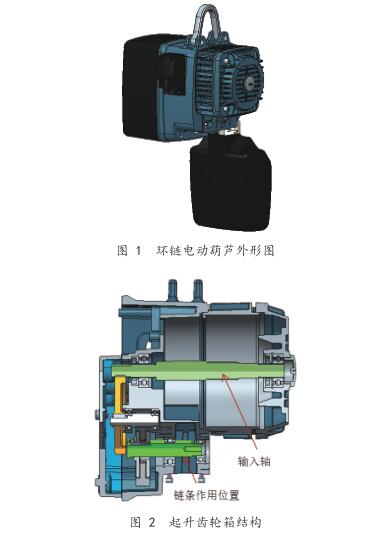環(huán)鏈電動(dòng)葫蘆屬于輕小型起重設(shè)備,具有體積小、自重輕、使用靈活、操作方便、適用性強(qiáng)等特點(diǎn)。根據(jù)有無運(yùn)行機(jī)構(gòu)分為固定式環(huán)鏈電動(dòng)葫蘆和運(yùn)行式環(huán)鏈電動(dòng)葫蘆,其起升機(jī)構(gòu)的整體結(jié)構(gòu)布置方式通常有同軸輸入同軸輸出結(jié)構(gòu)和C形結(jié)構(gòu)布置兩種形式。文中研究的環(huán)鏈電動(dòng)葫蘆為固定式,起升機(jī)構(gòu)采用C形結(jié)構(gòu)布置形式。起升齒輪箱作為環(huán)鏈電動(dòng)葫蘆核心部件,必須確保在使用壽命期內(nèi)安全、可靠地工作,需要對起升齒輪箱進(jìn)行有限元靜力分析,以保證其強(qiáng)度、剛度滿足工程要求。