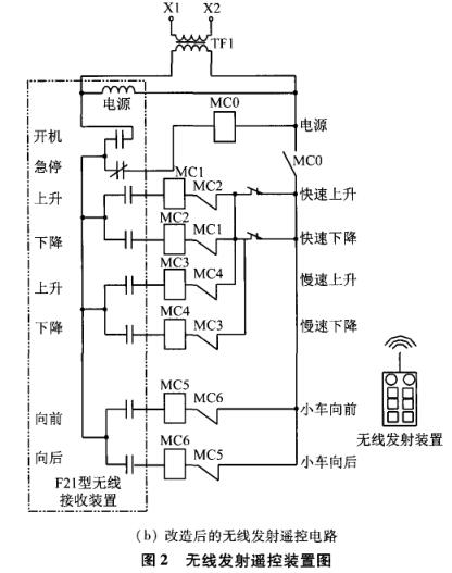 無線遙控裝置主要是解決工作人員拖拽電纜帶來的安全隱患。無線遙控裝置采用F21一E 1B無線控制設備,裝 BJX 防爆接線箱內實現(xiàn)防爆性能。該裝置把無線接收裝置接入電動葫蘆上的控制回路,用接收裝置內繼電器控制板替代原按鍵的開關量進行控制;無線發(fā)射裝置(遙控器)控制繼電器控制板的動作。兩臺電動葫蘆無線控制裝置采用不同頻率的電路板進行控制,以避免誤動作??刂苹芈冯娐穲D如圖2所示。