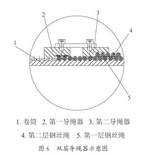 采用單根鋼絲繩雙層同向纏繞的方式:鋼絲繩兩端分別固定于卷筒的同一端部,鋼絲繩的一端在卷筒上卷繞形成第一層鋼絲繩,鋼絲繩的另一端在卷筒與第一層鋼絲繩上卷繞形成第二層鋼絲繩。同時(shí)卷筒上安裝有防止第一層鋼絲繩亂繩的第一導(dǎo)繩器,第一層鋼絲繩上安裝有防止第二層鋼絲繩亂繩的第二導(dǎo)繩器,2個導(dǎo)繩器之間向固定連接,如圖6所示。運(yùn)行時(shí),第一導(dǎo)繩器與第二導(dǎo)繩器同時(shí)工作,向相同方向移動,從而實(shí)現(xiàn)兩層鋼絲繩能同時(shí)卷繞或釋放,進(jìn)而實(shí)現(xiàn)在電動葫蘆體積不變的情況下,起升高度幾乎是原電動葫蘆的2倍,大大提高了電動葫蘆的起升高度。