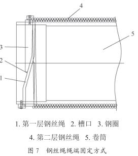 由于第一層鋼絲繩和第二層鋼絲繩在卷筒上有高度差(即鋼絲繩直徑差),使得在卷筒上固定時(shí)不能很好的固定,故需在卷筒上鋼絲繩固定端焊接一鋼圈,鋼圈上開一槽口,將第一層鋼絲繩穿過槽口用壓繩器固定在卷筒上,第二層鋼絲繩用壓繩器固定在鋼圈外表面上完成整個電動葫蘆的繞繩。如圖7所示。