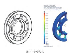 1) 滑輪優(yōu)化 通過有限元的方法對滑輪進(jìn)行計算,優(yōu)化受力結(jié)構(gòu),在滿足承載能力的前提下盡量減輕其自重。減少滑輪自重不僅能降低生產(chǎn)成本還有助于降低吊鉤組整體重心位置改善空鉤使用性能。詳見圖 3。