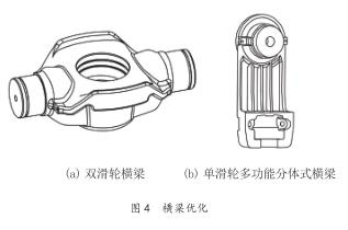 2) 橫梁優(yōu)化 不拘泥于傳統(tǒng)橫梁標(biāo)準(zhǔn),采用新的材料新的制造方法及結(jié)構(gòu)進(jìn)行設(shè)計。優(yōu)化其受力分布減少應(yīng)力集中,簡化生產(chǎn)工藝。增加操作抓手功能,提供指定的抓握位置使操作更合理,避免由于操作部位及方法不當(dāng)對設(shè)備及操作人員安全造成損害。下沉式設(shè)計降低橫梁重心。見圖 4。