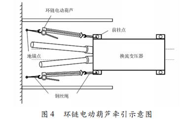 電動葫蘆根據(jù)牽引材料不同分為鋼絲繩和環(huán)鏈電動葫蘆,在同等規(guī)格條件下,環(huán)鏈電動葫蘆在運(yùn)行距離、使用壽命、定位精度等方面均具有優(yōu)勢。為確保換流變平穩(wěn)牽引,采用兩臺環(huán)鏈電動葫蘆同步牽引,用牽引鋼絲繩、卸扣以及環(huán)鏈電動葫蘆將換流變與地錨連接在一起,如圖4所示。