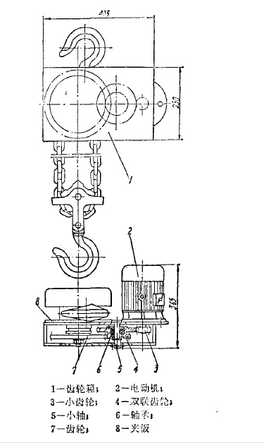 ? 某些場合因為三噸手動葫蘆操作速度低、勞動強度較大,所以在原有墓礎上,將手動葫蘆改為電機齒輪傳動,來提高丁生產(chǎn)效率,滿足了生產(chǎn)要求。具體的改裝示意圖如圖1。將原來手動葫蘆的鏈條和手鏈輪拆除,在夾板8上用螺釘固定齒輪箱1,1.1千瓦電動機固定在齒輪箱上。通過小齒輪3和雙聯(lián)齒輪4,傳到與手拉葫蘆主軸用三頭螺紋聯(lián)接的齒輪7上。操縱電機的反正轉(zhuǎn),即可平穩(wěn)地提取或放下重物。